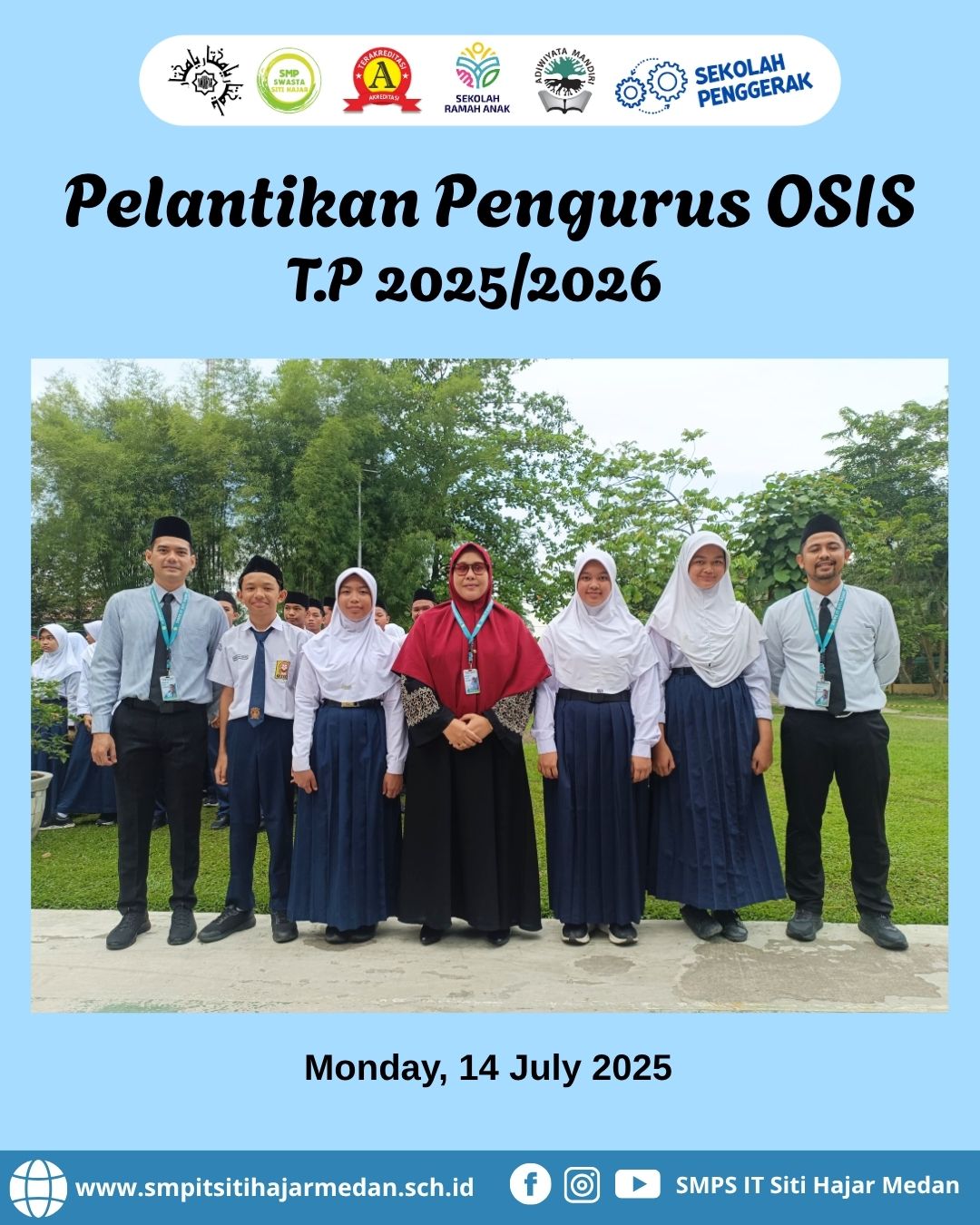 Menumbuhkan Jiwa Kepemimpinan Sejak Dini Senin, 14 Juli 2025 — SMPS IT Siti Hajar Medan menggelar kegiatan Pelantikan Pengurus OSIS Tahun Pelajaran 2025/2026 di halaman sekolah dengan khidmat dan penuh...