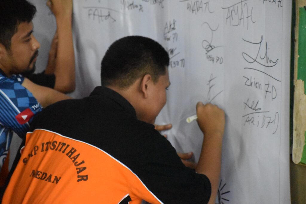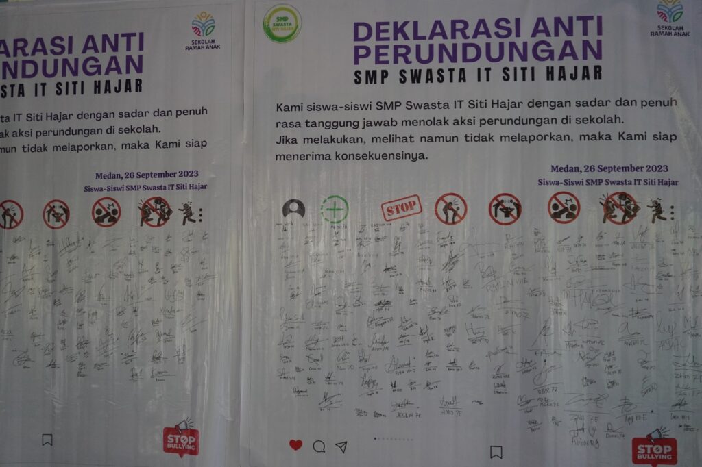 Sebelum penutupan acara, para siswa membacakan deklarasi anti bullying, mengekspresikan tekad mereka untuk melawan perundungan, dan menandatanganinya sebagai komitmen nyata.